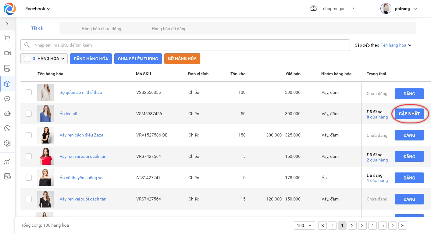 – Đối với các hàng hóa đã đăng lên tất cả Fanpage của cửa hàng, OCM sẽ hiển thị nút Cập nhật thay cho nút Đăng