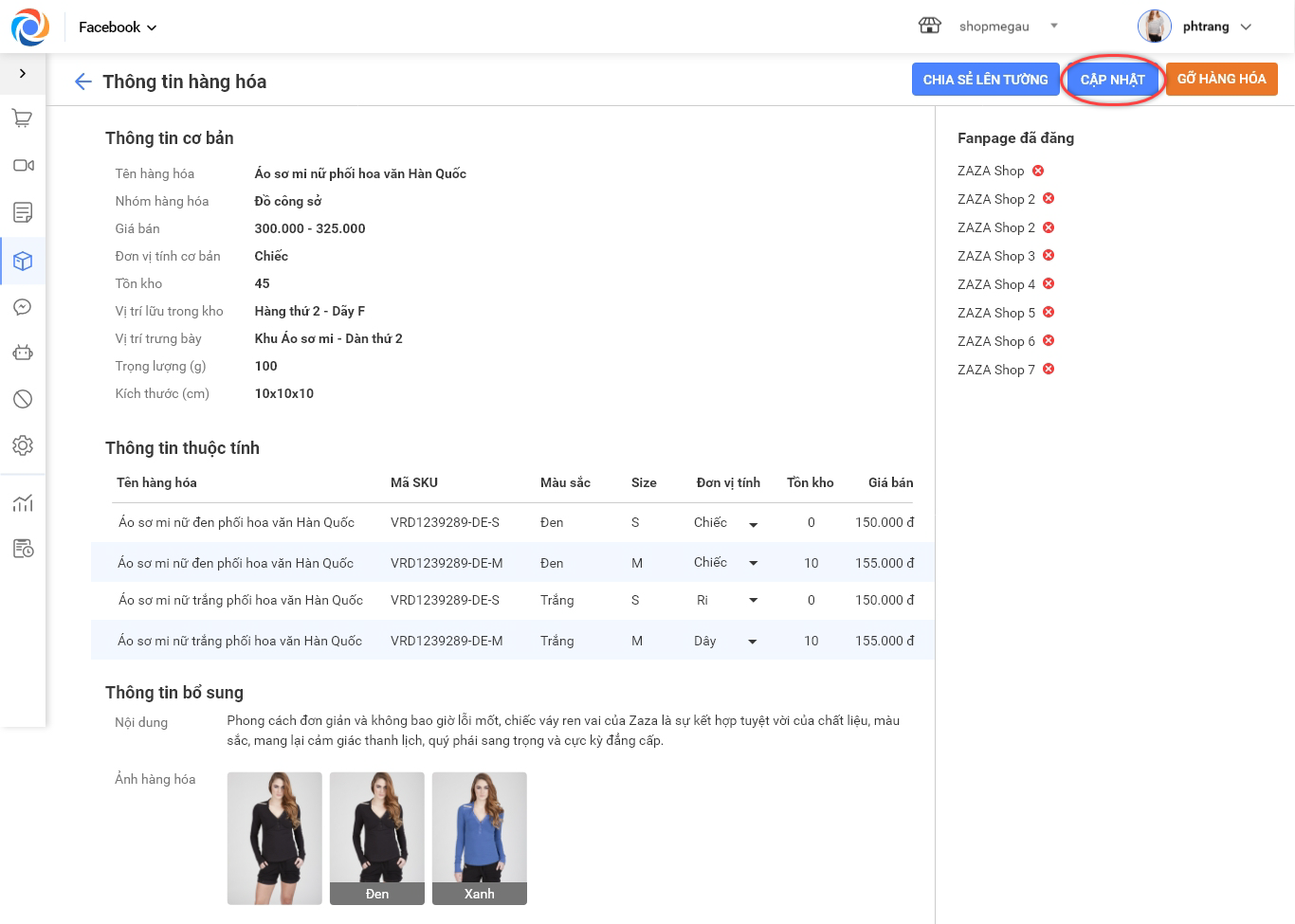 – Nhấn vào Cập nhật để sửa thông tin sản phẩm đăng trên Fanpage.