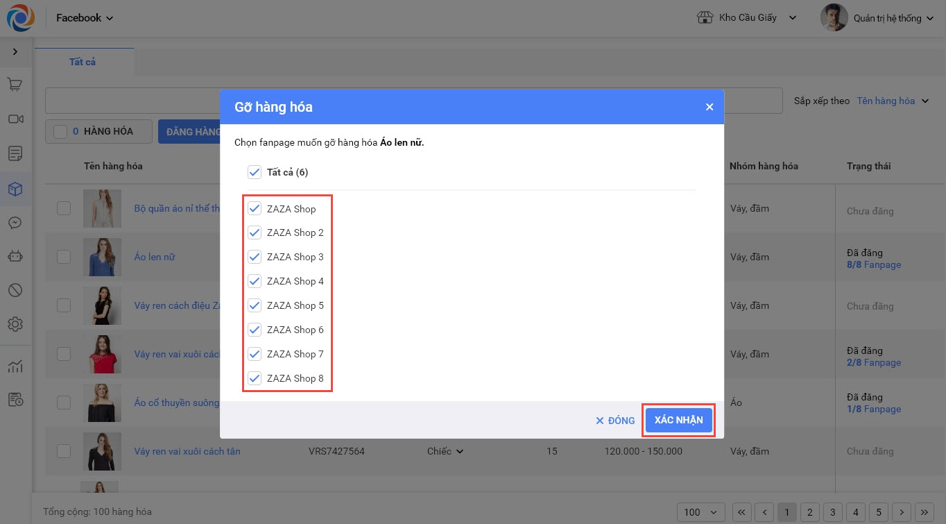 6.1. Gỡ hàng hóa trên tất cả các fanpage: