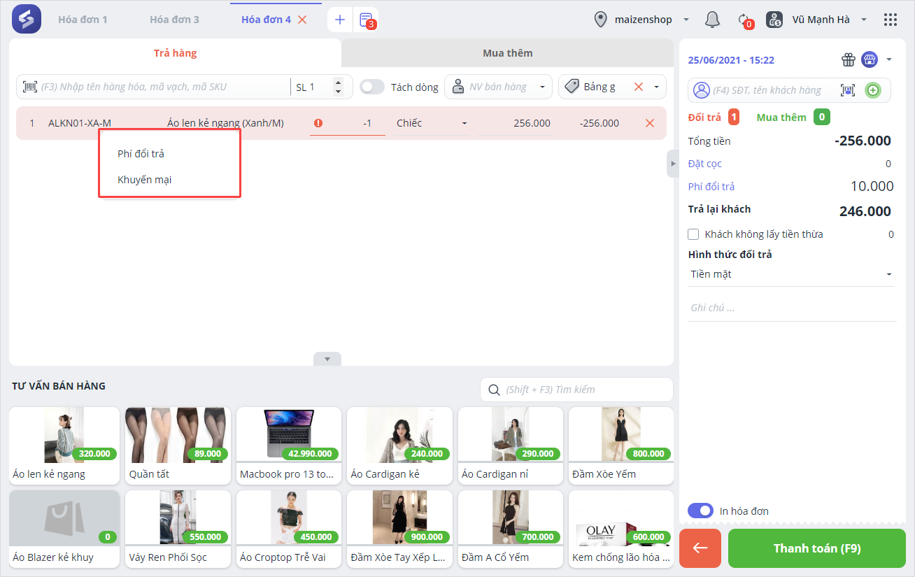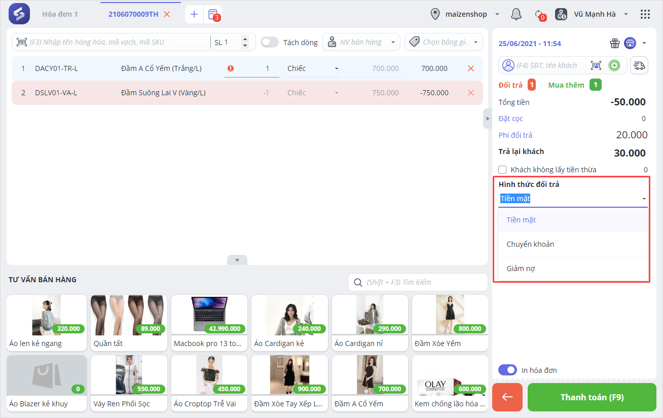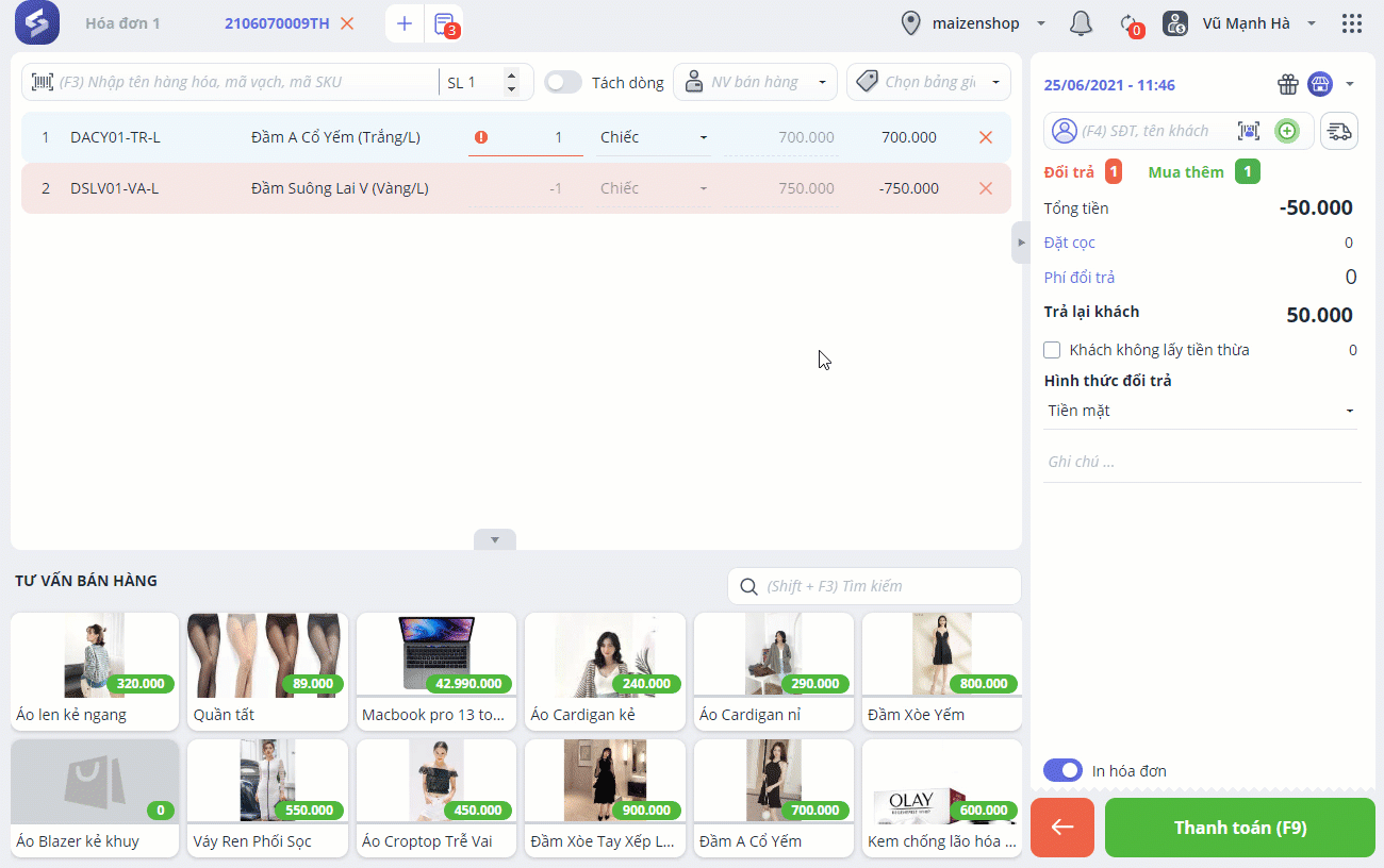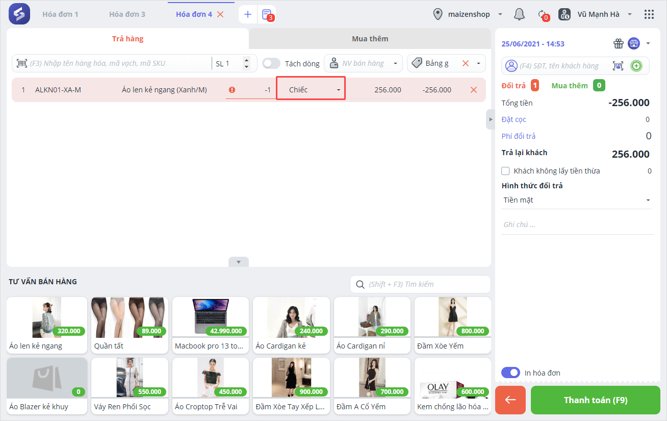 Thu ngân thực hiện đổi trả hàng hóa cho khách như các trường hợp trên.