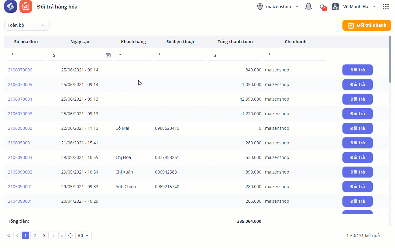 3.1. Ghi nhận yêu cầu đổi trả của khách theo hóa đơn đã mua trước đó
