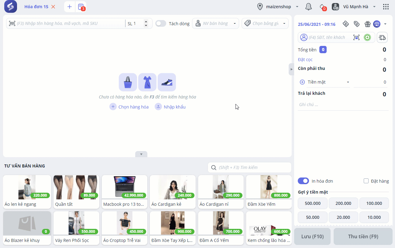 - Trường hợp cửa hàng có quản lý thông tin khách hàng, nhập mã khách hàng, số điện thoại hoặc tên để chọn thông tin khách.