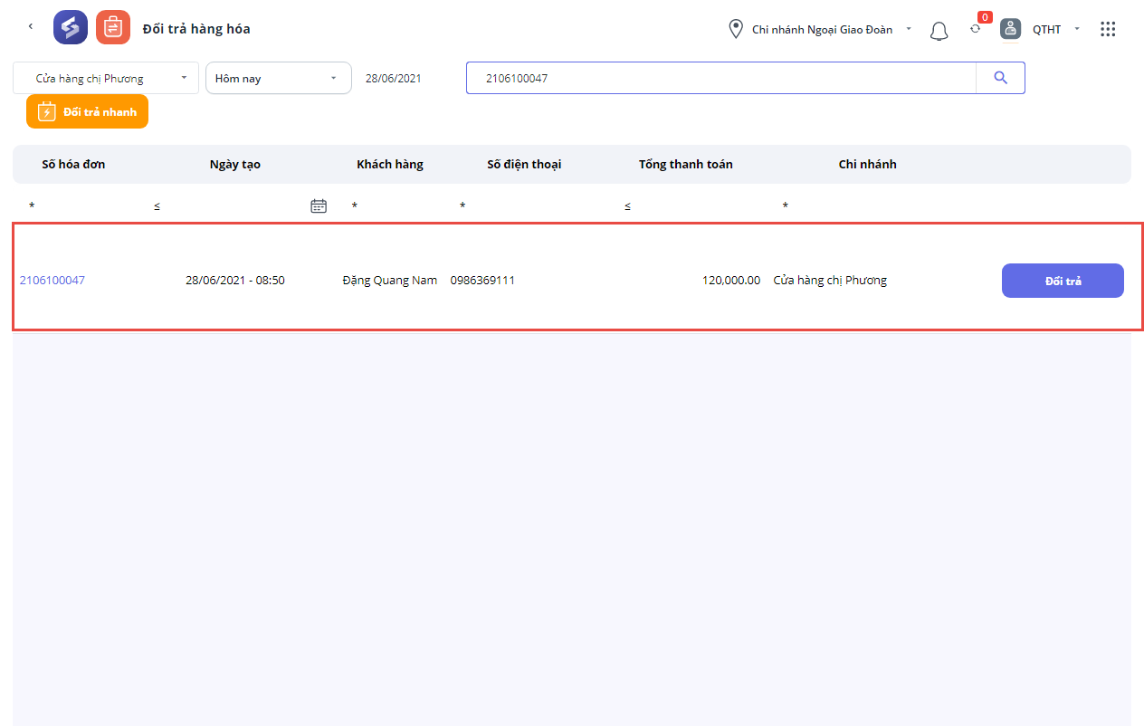 Bước 3: Chương trình hiển thị chi nhánh cần đổi trả theo số hóa đơn thu ngân tìm kiếm.