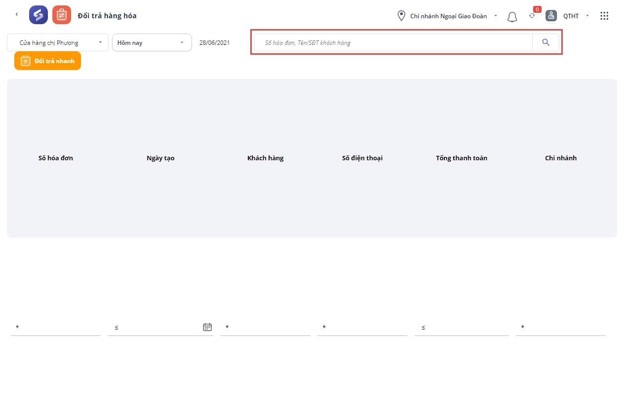 Lưu ý: Thu ngân của chi nhánh này không có quyền xem danh sách hóa đơn của chi nhánh khác, cần nhập chính xác số hóa đơn/tên/SĐT khách hàng để tìm kiếm hóa đơn cần đổi trả.