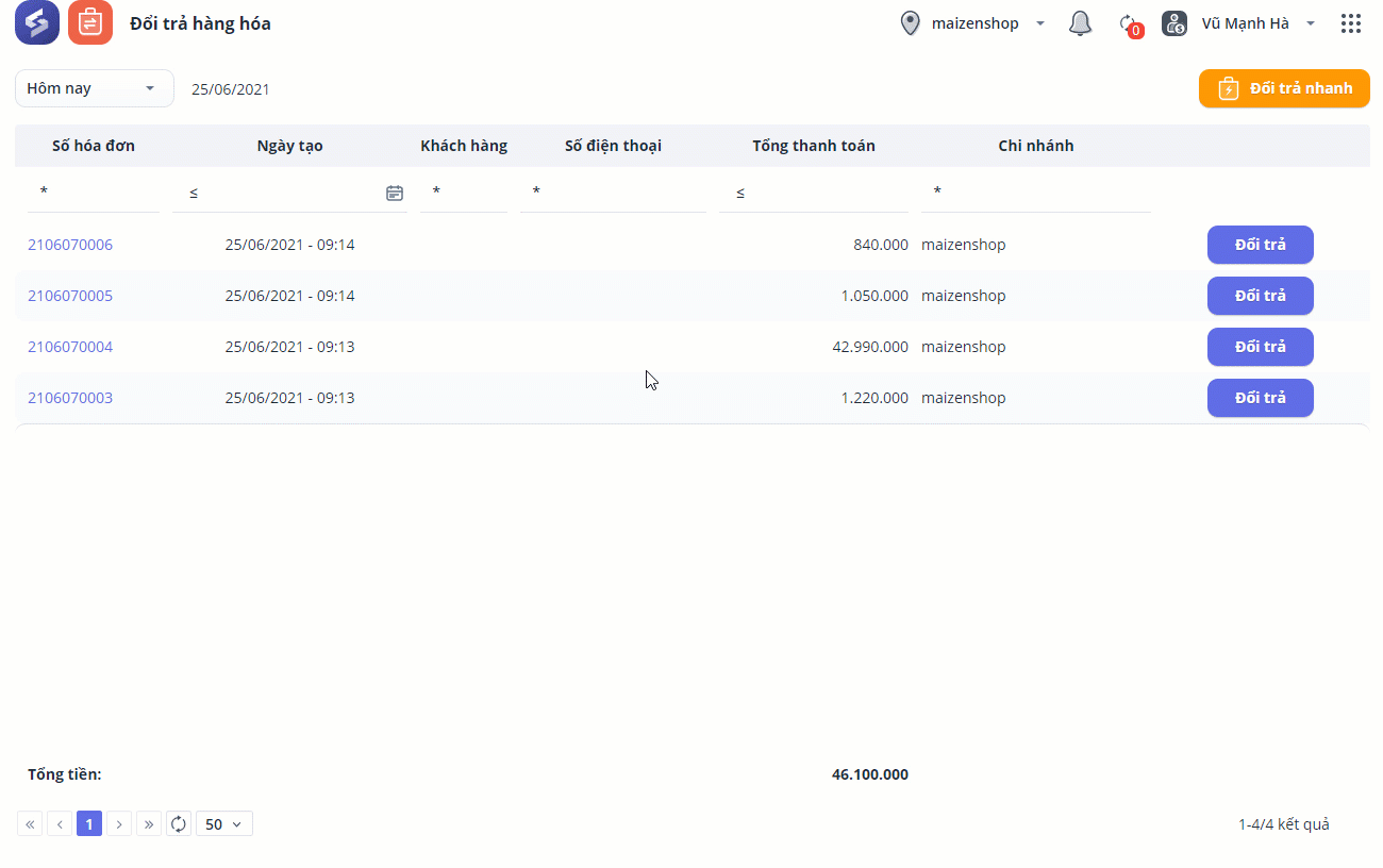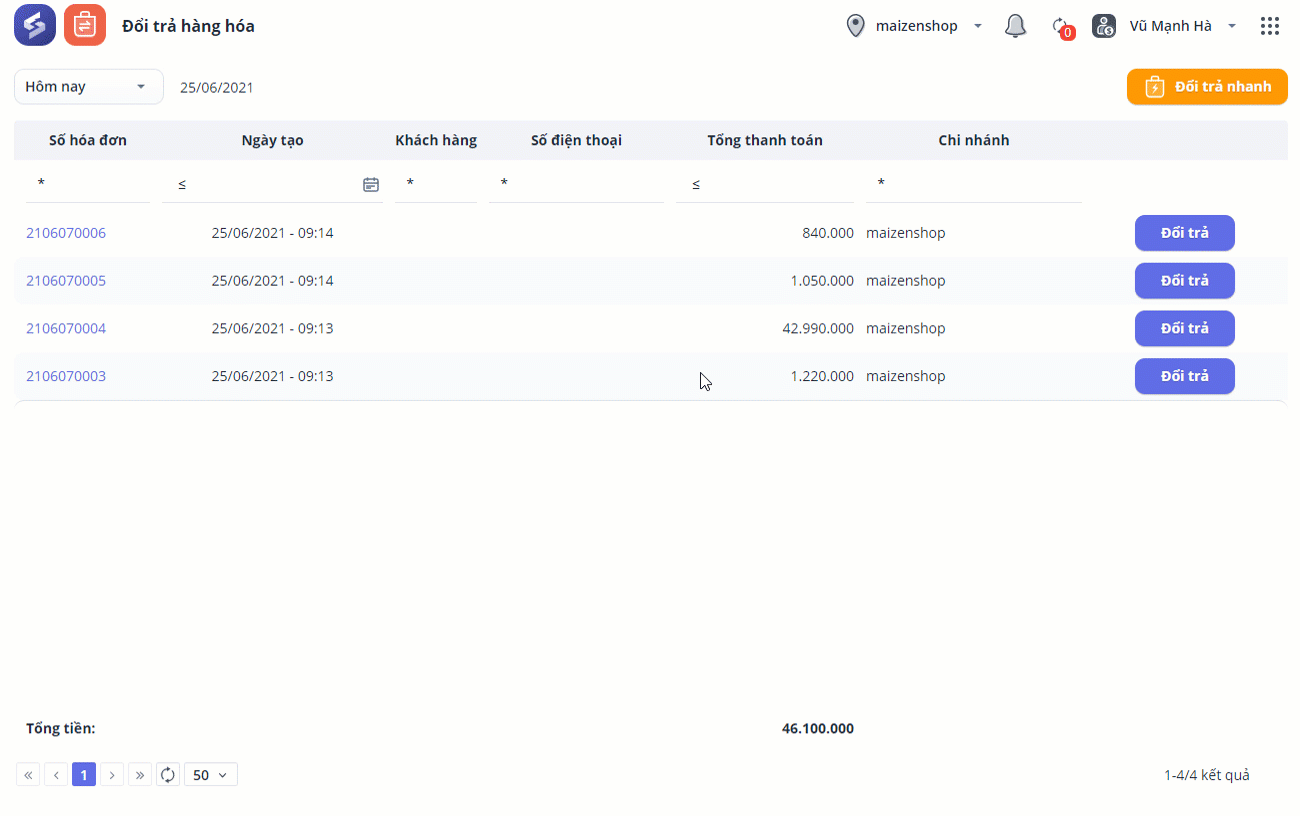 Bước 1: Chọn Đổi trả nhanh