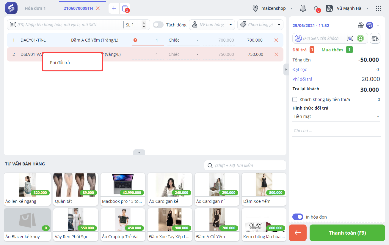 Bước 4: Nếu cửa hàng có tính phí khi khách đổi trả hàng, nhập số tiền phí tại ô Phí đổi trả.