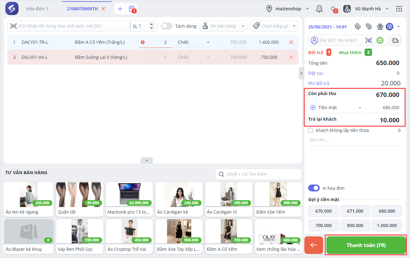 Nếu hàng hóa khách mua có giá trị lớn hơn hàng đổi trả, khách sẽ phải trả thêm 1 khoản tiền cho cửa hàng. Theo dõi số tiền khách cần trả thêm tại mục Còn phải thu. Sau đó, nhập Số tiền khách đưa và nhấn Thanh toán.