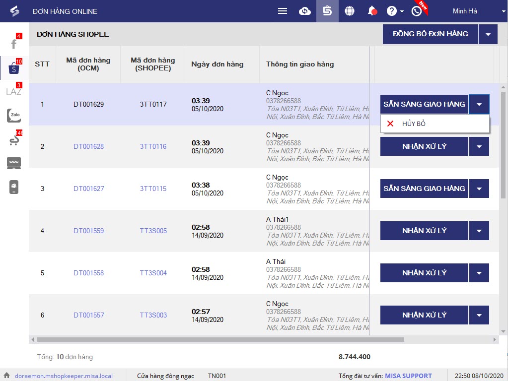 + Với những đơn trên shopee, người bán đã chuyển trạng thái sang Đã xử lý thì trên PC sẽ có chức năng Nhận xử lý. Nhấn Nhận xử lý để lập hóa đơn và quản lý trạng thái đơn hàng trên shopee. Nhấn Hủy đơn hàng để hủy đơn hàng trên shopee.