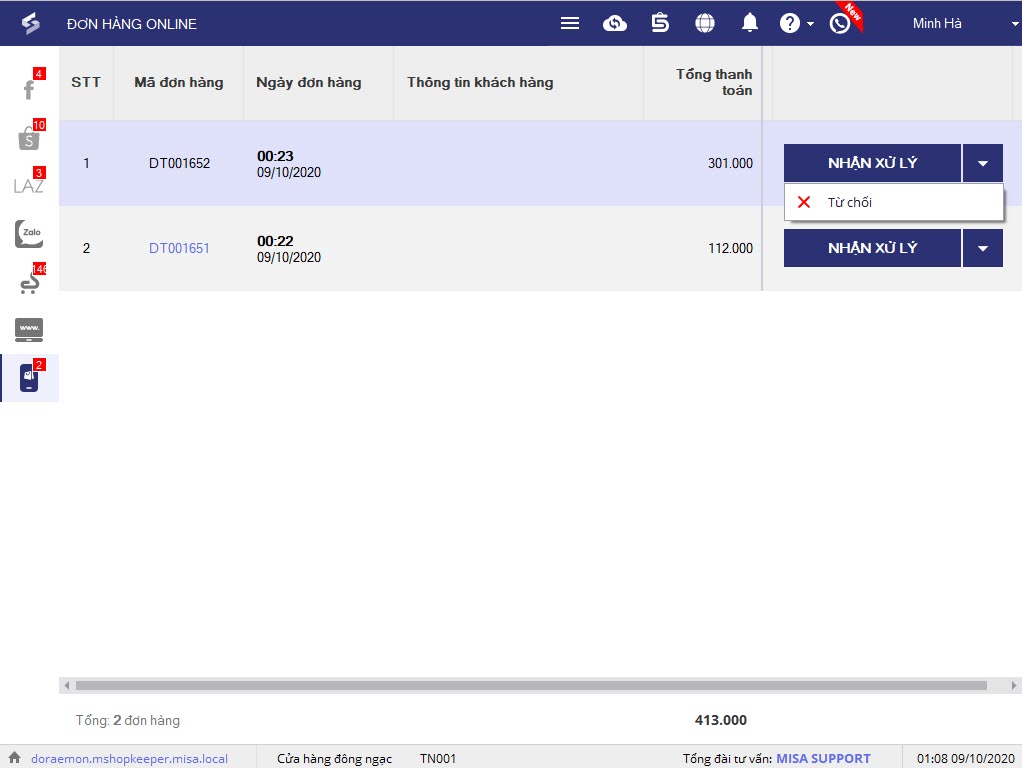 trên thanh công cụ để xem danh sách đơn hàng từ Website/Trang đặt hàng. - Nhấn Nhận xử lý/Hủy đơn.