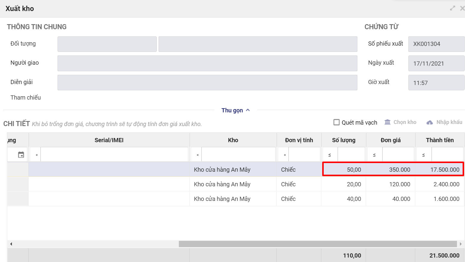 - Giá trị tồn kho tại thời điểm xuất = Số lượng tồn kho * Đơn giá.