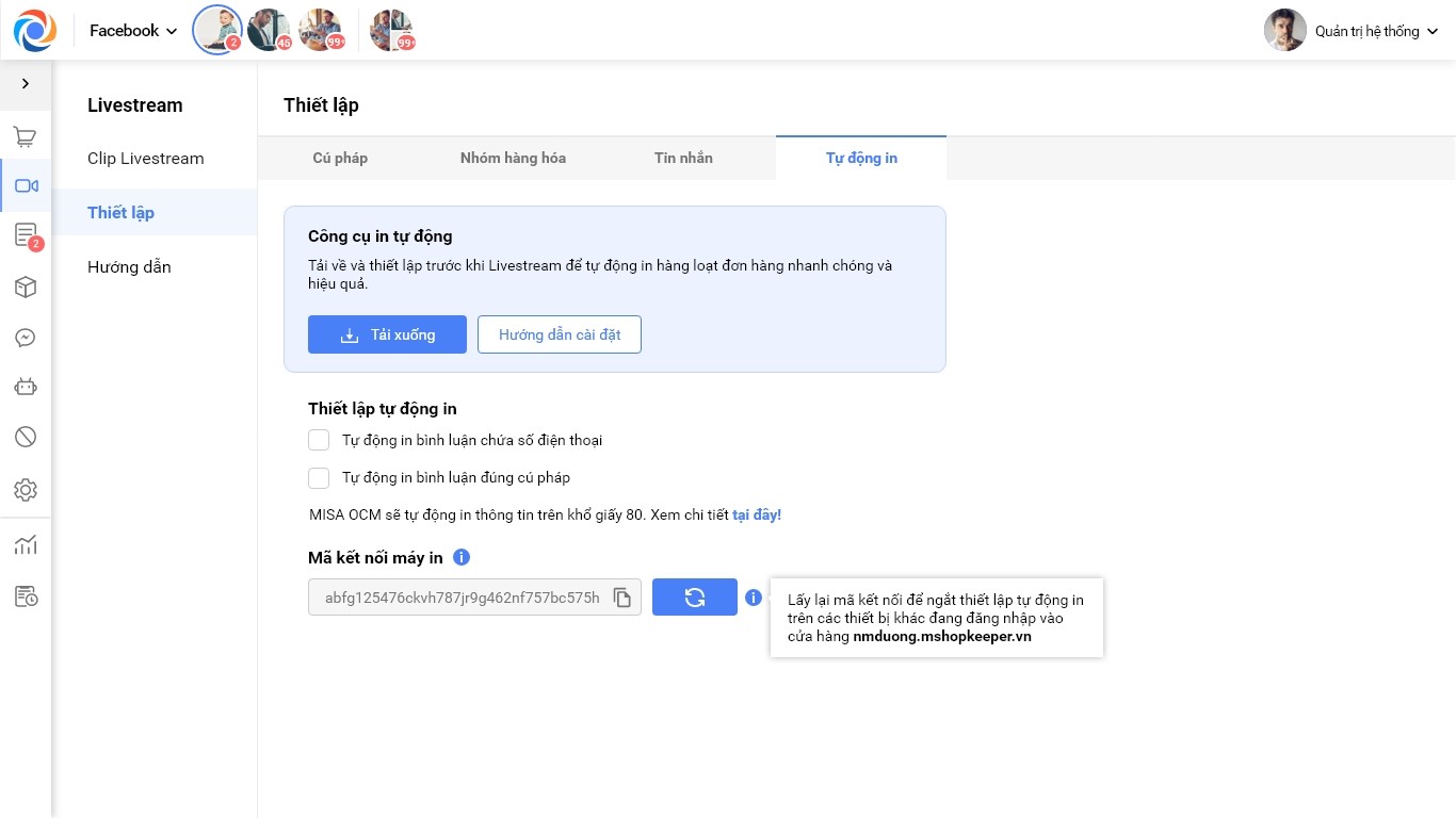 • Mã kết nối: Là chuỗi ký tự do OCM tự sinh, giúp kết nối máy in của cửa hàng với công cụ để tự động in bình luận Livestream