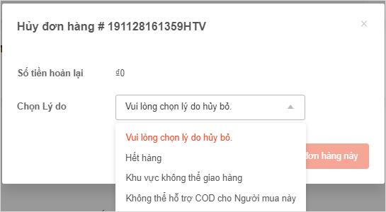 Nhấn “Hủy đơn hàng” hiển thị Form cho phép nhập lý do hủy