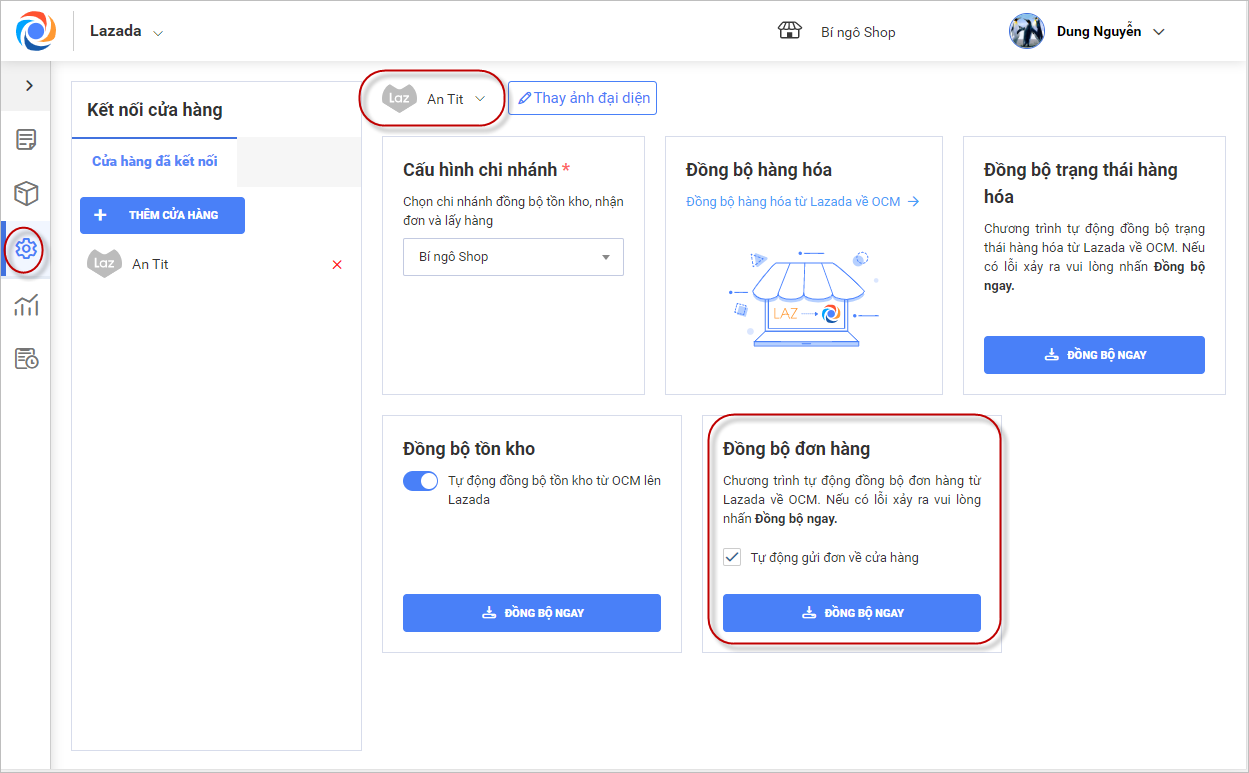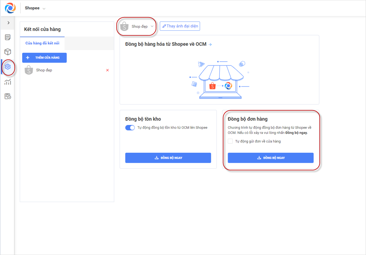 Lưu ý: Bạn nhớ chọn đúng gian hàng đang làm việc để thực hiện đồng bộ thông tin đơn hàng