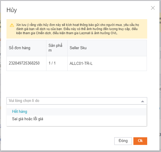 Khi nhận được thông báo hủy không thành công trên OCM, bạn vui lòng lên cửa hàng trên Lazada -> Danh sách đơn hàng -> Nhấn “Hủy”