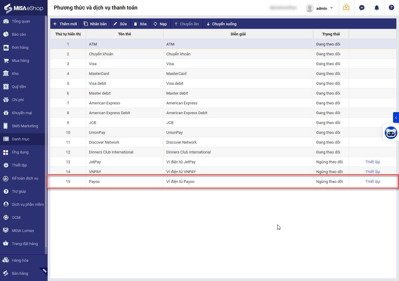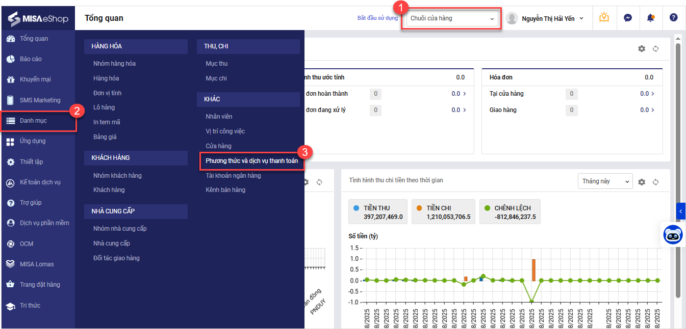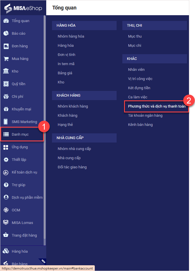 Bước 2: Vào Danh mục/Phương thức và dịch vụ thanh toán