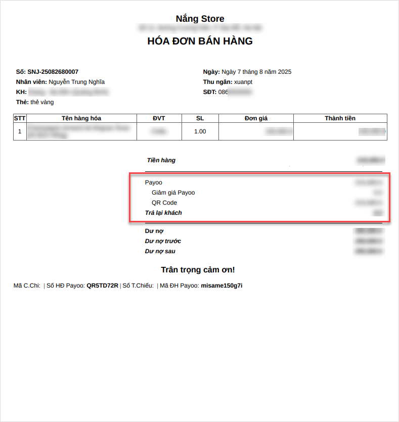 Đồng thời, hóa đơn sẽ được in ra, hiển thị hình thức thanh toán qua Payoo để thu ngân và khách hàng dễ dàng đối chiếu