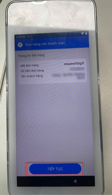 – Đơn hàng cần thanh toán sẽ hiển thị trên máy POS cầm tay. Thu ngân mở máy POS cầm tay, kiểm tra thông tin và nhấn Tiếp tục.