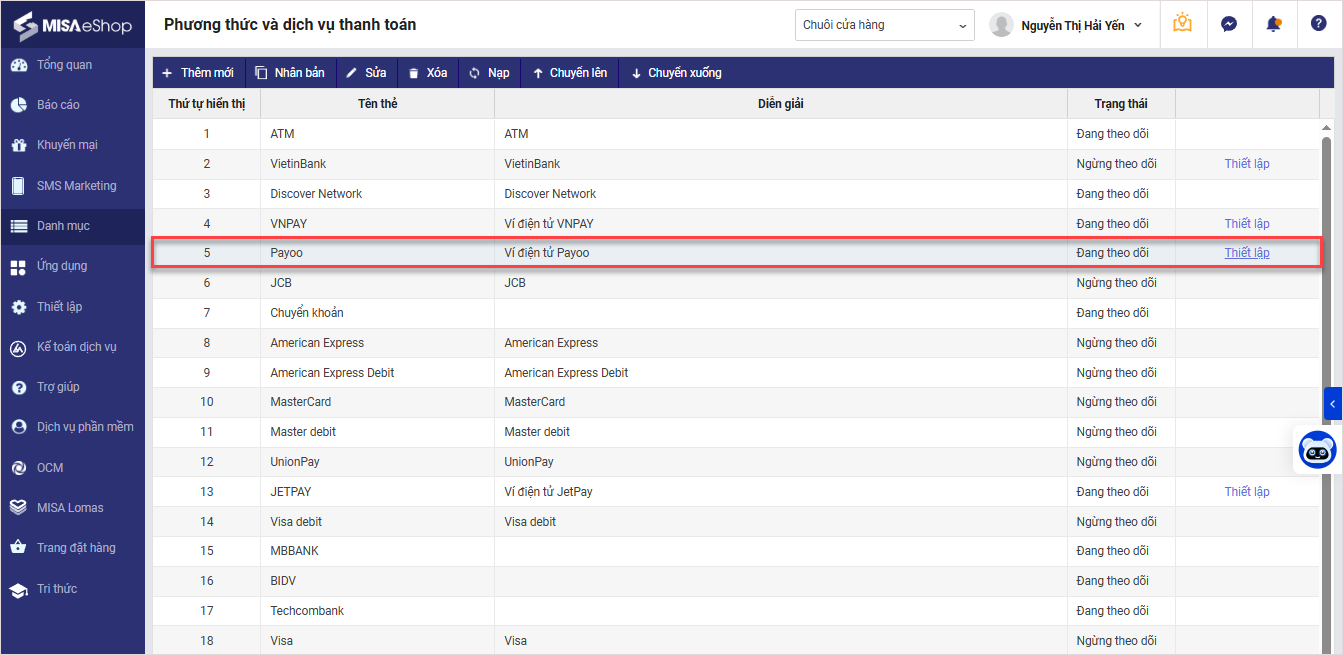 Bước 3: Tìm đến phương thức thanh toán Payoo và nhấn Thiết lập