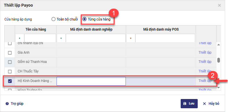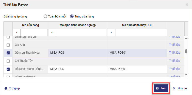 – Tích chọn vào cửa hàng muốn thiết lập mã định danh máy POS và nhấn Thiết lập