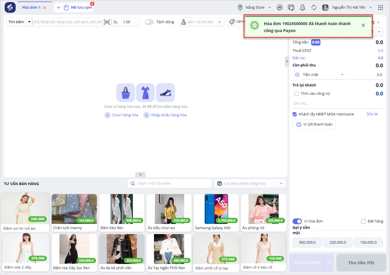 Bước 3: Sau khi người mua hàng thực hiện thanh toán thành công, thu ngân sẽ nhận được thông báo khách hàng đã thanh toán thành công qua Payoo trên màn hình bán hàng như ảnh dưới đây.