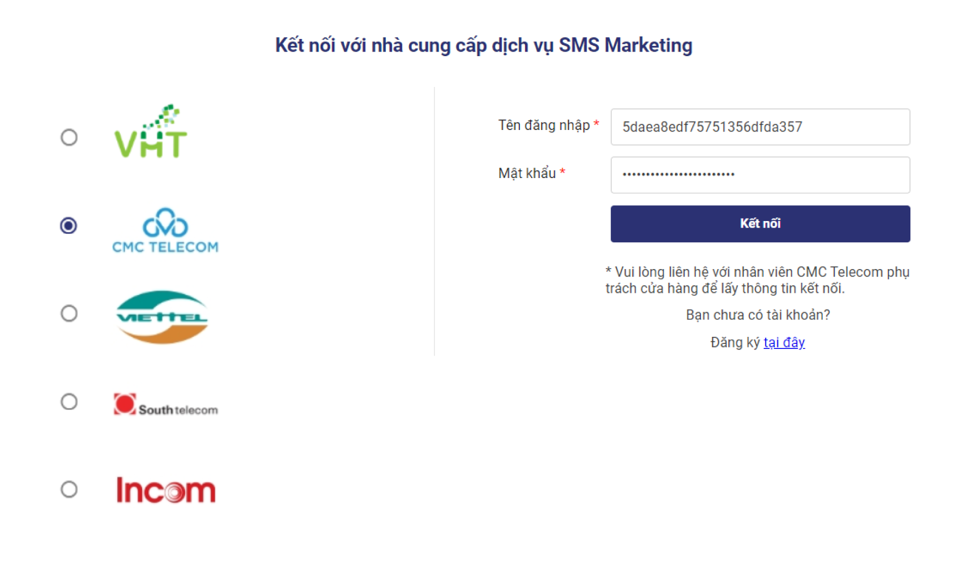 Bước 1: Đăng ký sử dụng dịch vụ SMS Marketing với các đơn vị VHT, CMC Telecom, Viettel, South Telecom, Incom (Nếu khách hàng đã có tài khoản sử dụng dịch vụ với các đơn vị thì bỏ qua bước này).