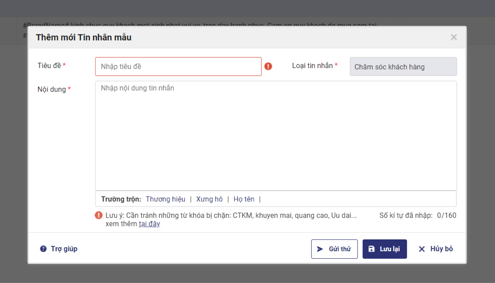 – Với đơn vị Incom, Viettel: Khách hàng cần nhập Thương hiệu theo đúng Thương hiệu đã đăng ký. Nếu nhập Thương hiệu không đúng: Tin nhắn sau khi gửi đi sẽ trả về kết quả gửi lỗi.