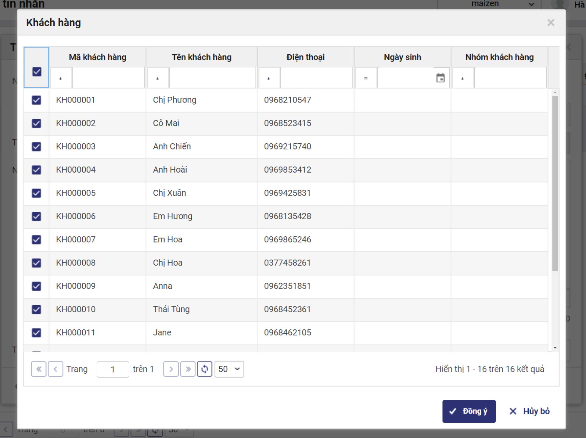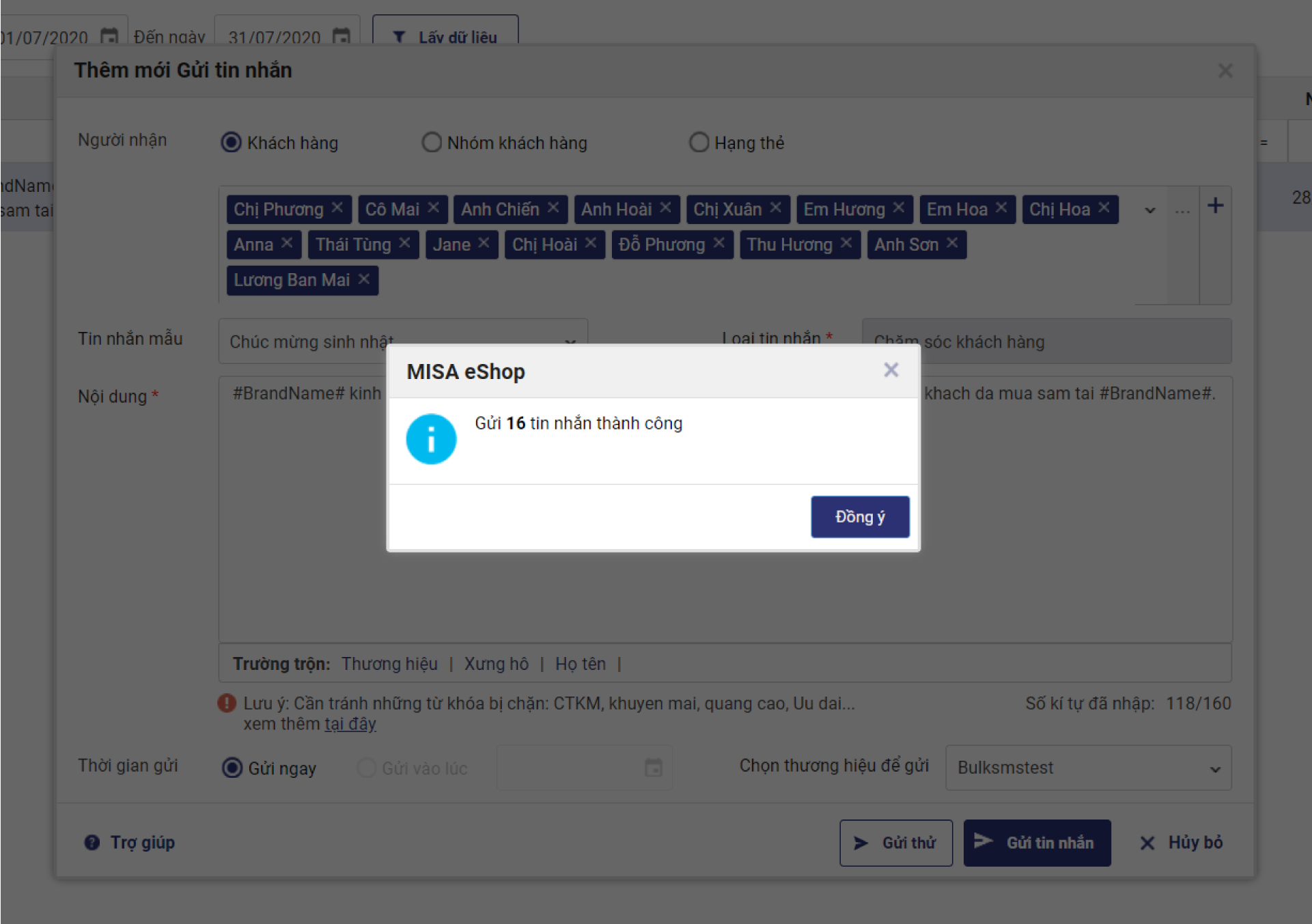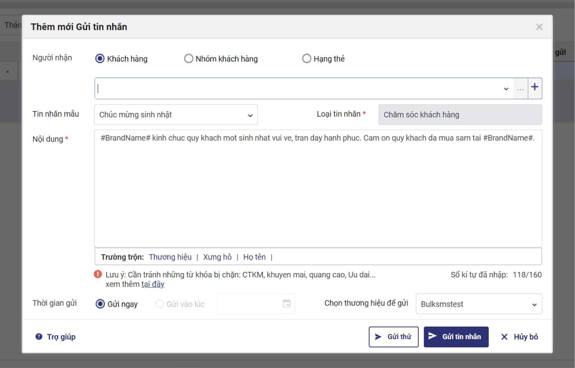 Chọn chức năng Gửi tin nhắn: Có thể gửi cho 1 khách hàng hoặc nhiều khách hàng trong danh sách.