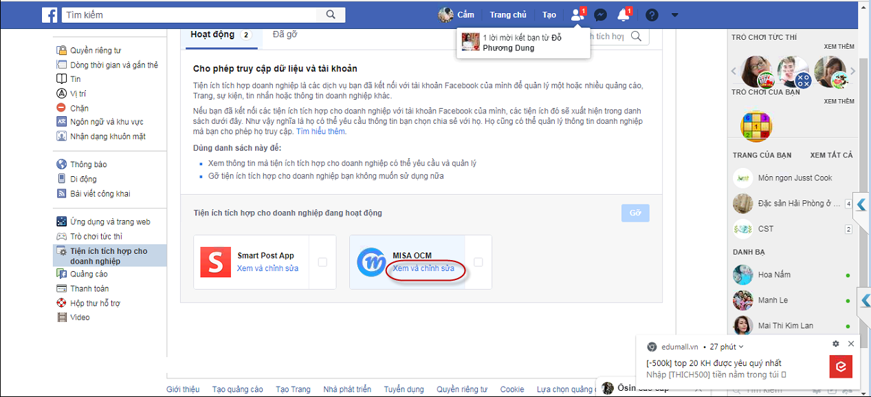 1. Đăng nhập TK Facebook, click vào biểu tượng ở góc trái màn hình, chọn Cài đặt\ Tiện ích tích hợp cho Doanh Nghiệp.
