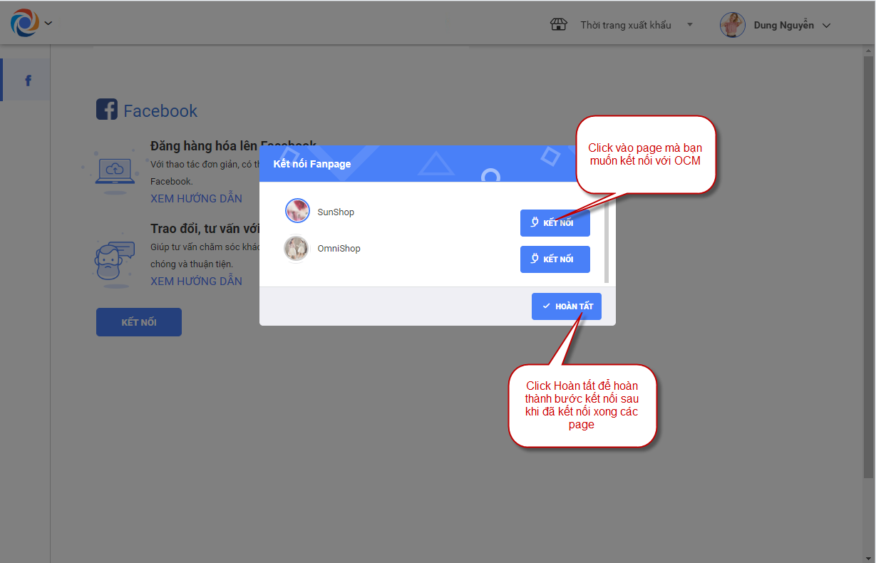 + Sau khi hoàn thành các thao tác trên bạn nhấn Kết nối với OCM, chương trình hiển thị danh sách các page của facebook để kết nối, chọn fanpage muốn kết nối và nhấn Đồng ý để kết nối thành công.