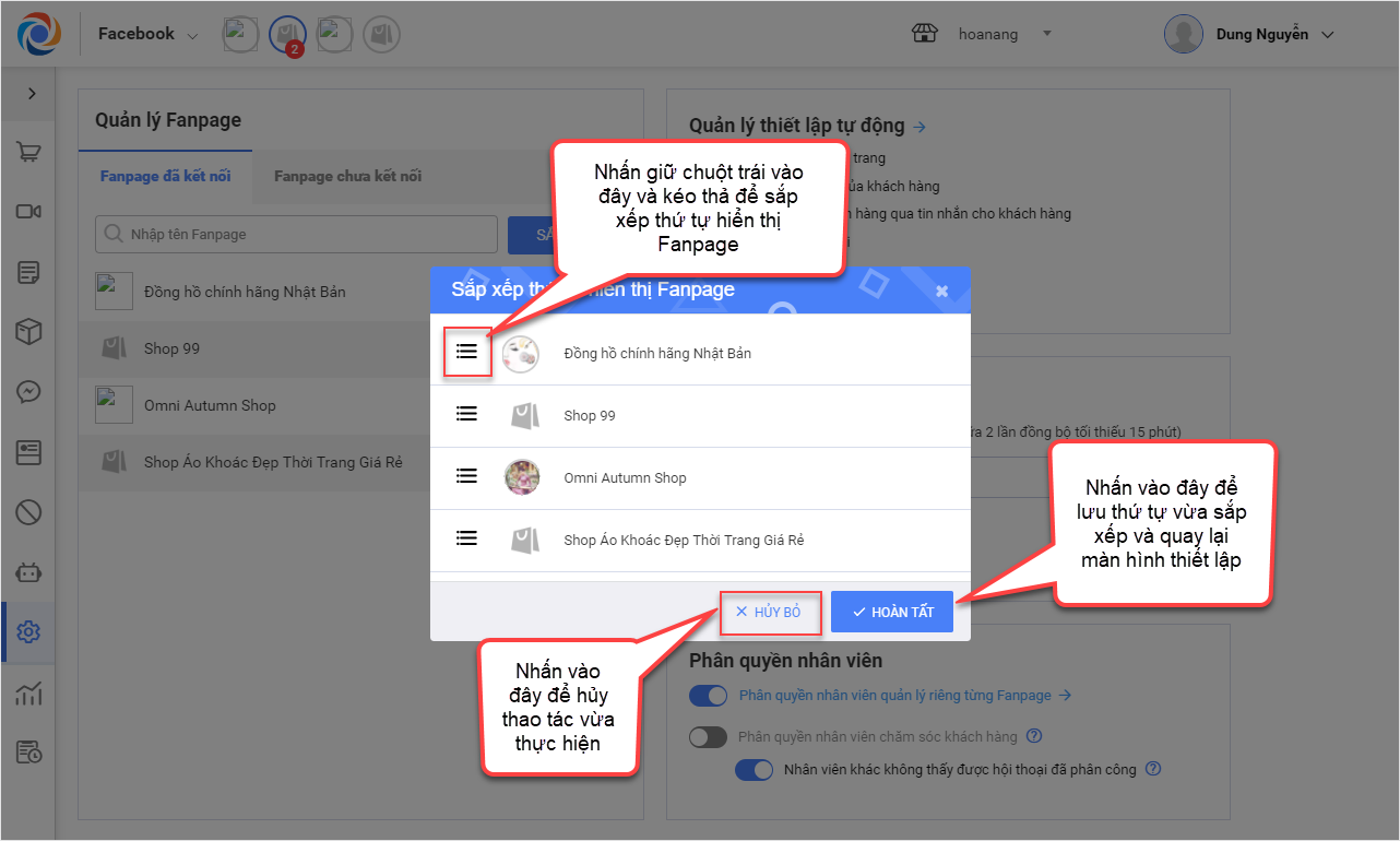 Bước 2: Để sắp xếp thứ tự hiển thị các Fanpage, nhấn vào biểu tượng và thay đổi thứ tự hiển thị Fanpage theo ý muốn.
