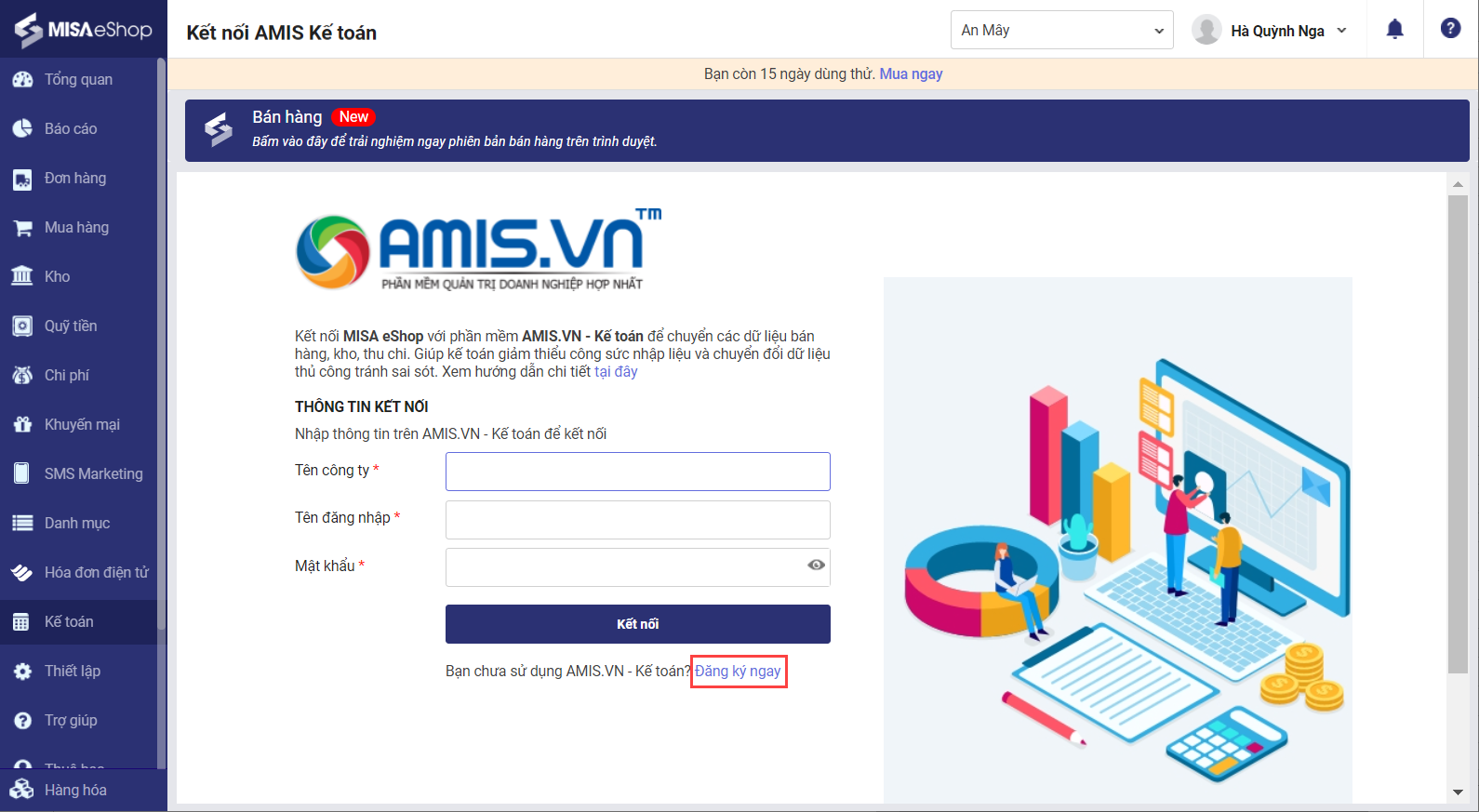 * Lưu ý: Với các cửa hàng chưa sử dụng phần mềm kế toán AMIS.VN của MISA thì mua phần mềm bằng cách nhấn Đăng ký ngay trên màn hình kết nối AMIS.VN).