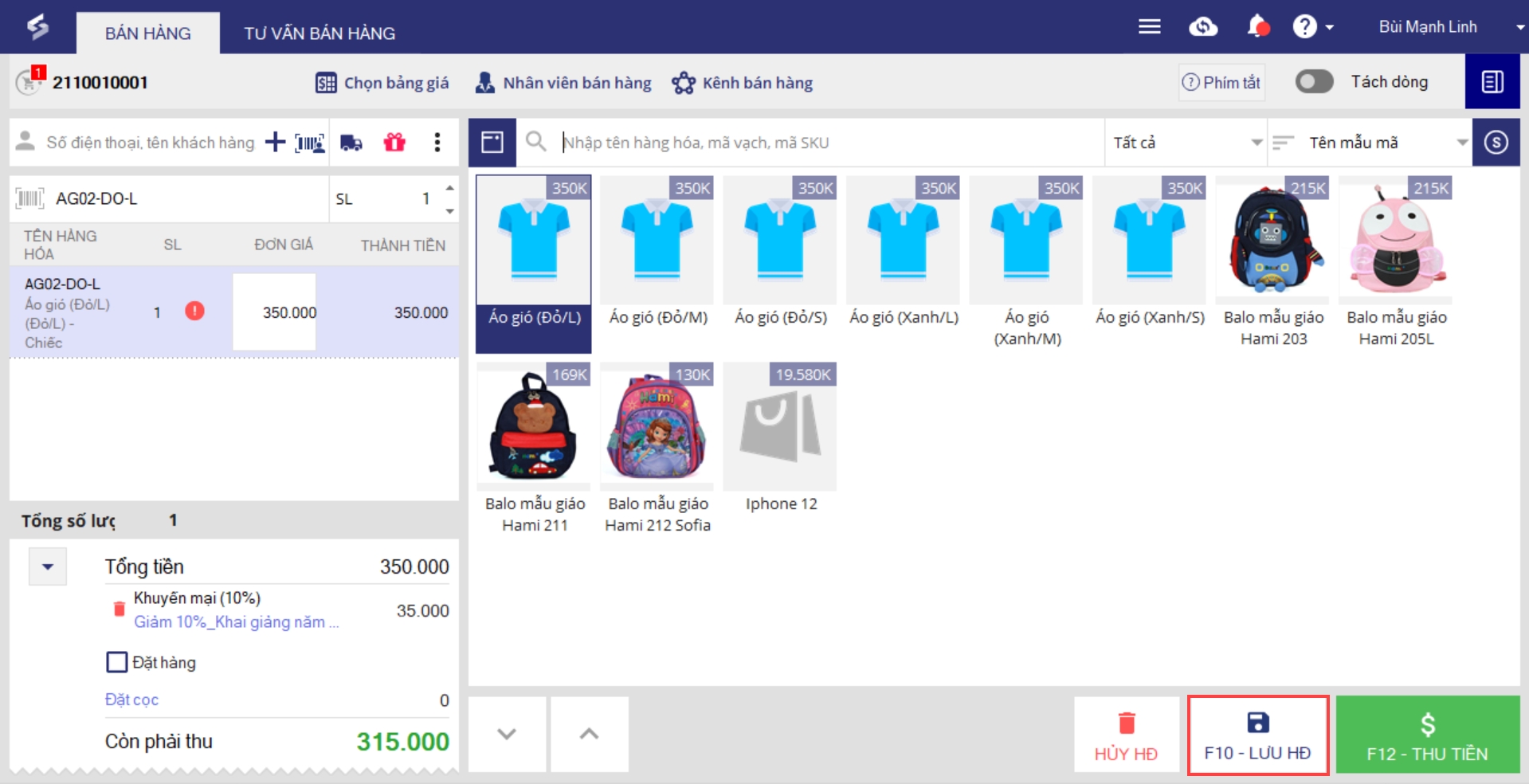 - Sau khi đã ghi nhận những mặt hàng khách chọn, nhấn F10 – Lưu HĐ.