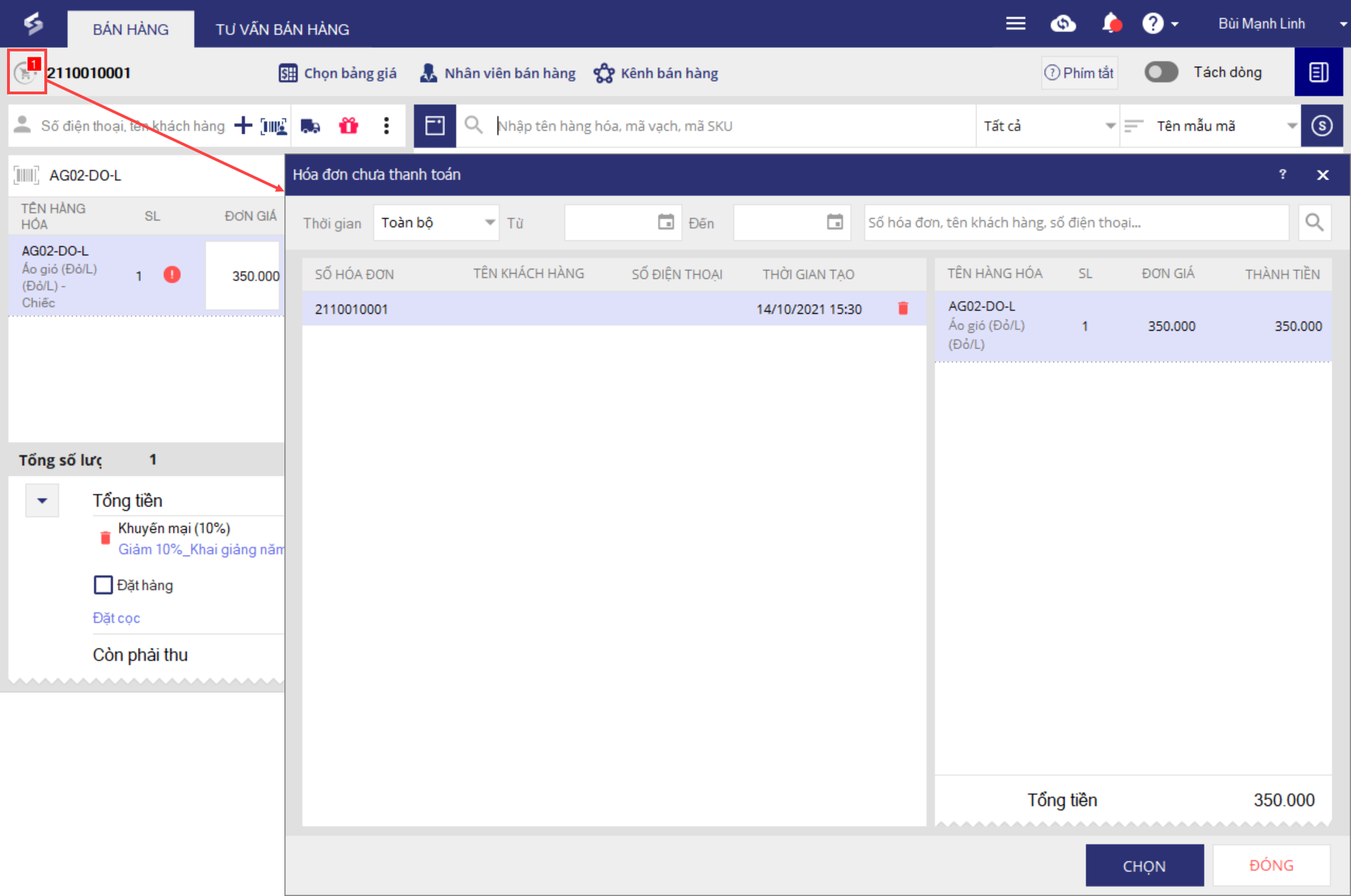 và chọn hóa đơn của khách. - Nhấn vào hóa đơn, nhấn Chọn.