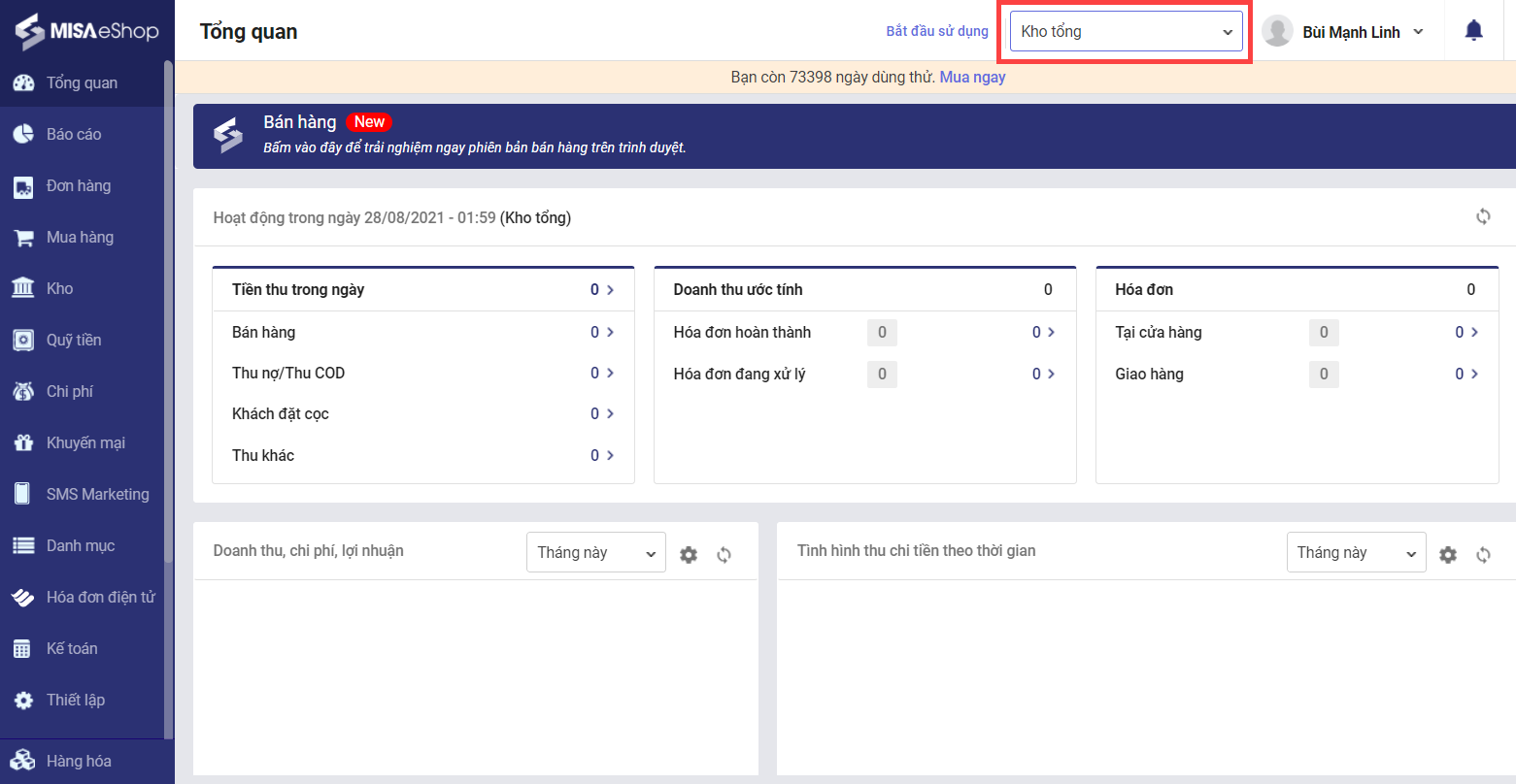 1. Nhấn chọn Kho tổng trên thanh chức năng chọn cửa hàng làm việc.