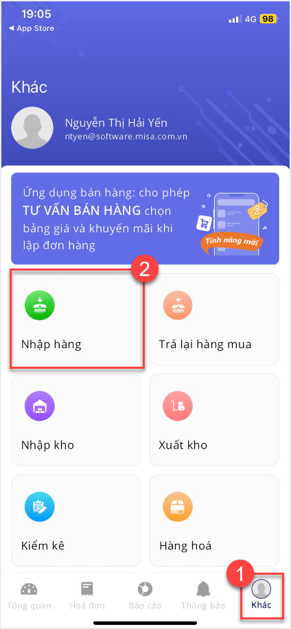 1. Chọn tab Khác, chọn mục Nhập hàng.