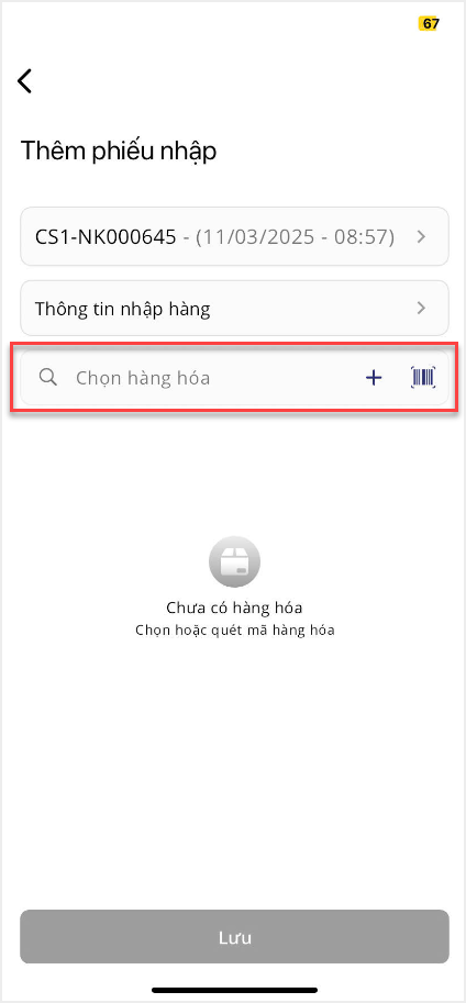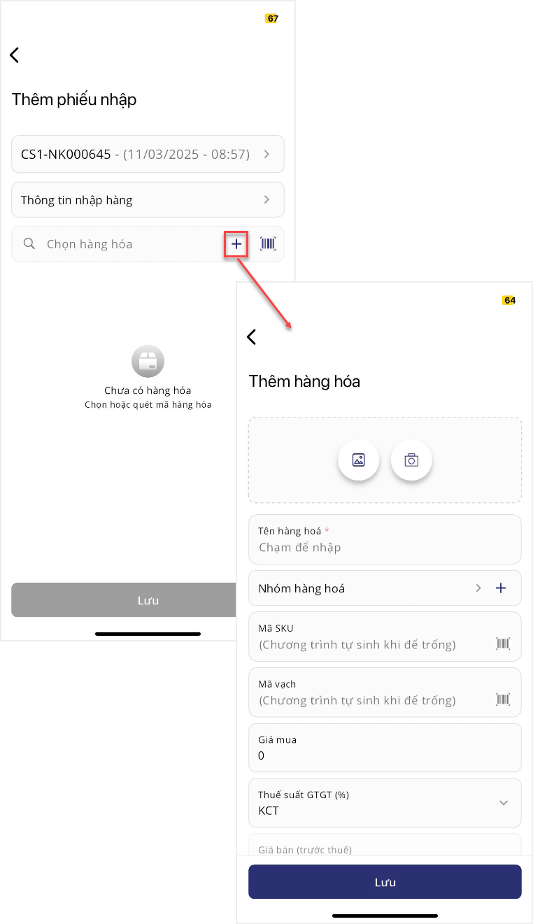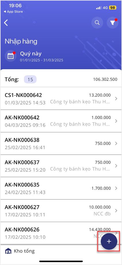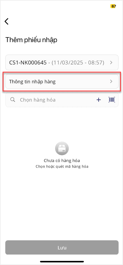 2. Tại màn hình Nhập hàng, nhấn vào biểu tượng