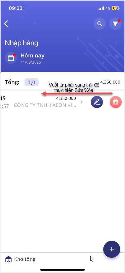 - Nếu muốn chỉnh sửa thông tin hoặc xóa phiếu nhập, trên thông tin Phiếu nhập hàng thực hiện vuốt từ phải sang trái và chọn các chức năng Sửa
