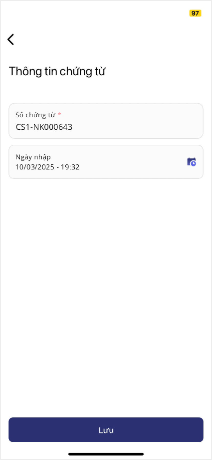 4. Nhấn chọn thông tin chứng từ để chỉnh sửa lại số chứng từ hoặc thời gian theo đúng thực tế. Sau đó, nhấn Lưu