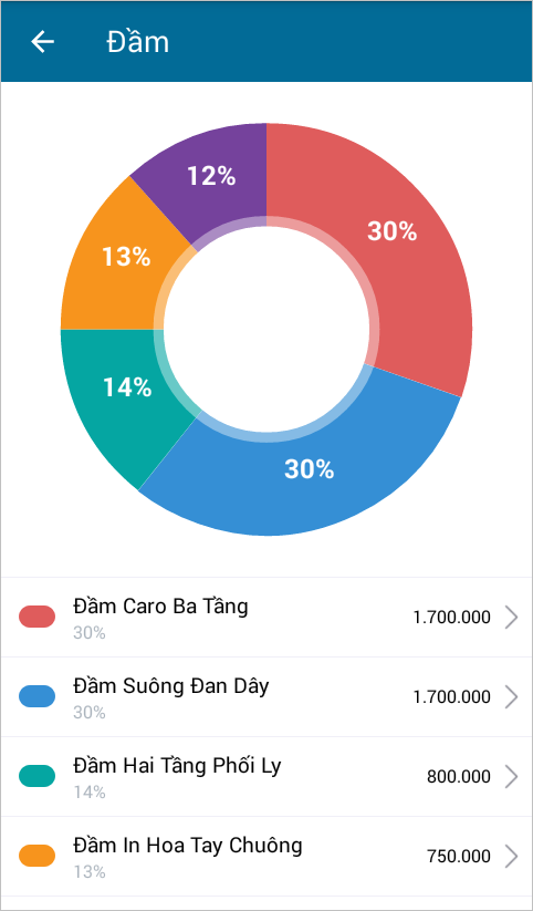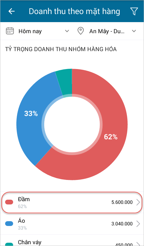 - Trên báo cáo Tỷ trọng doanh thu nhóm hàng hóa, có thể xem tỷ trọng doanh thu chi tiết theo từng hàng hóa.