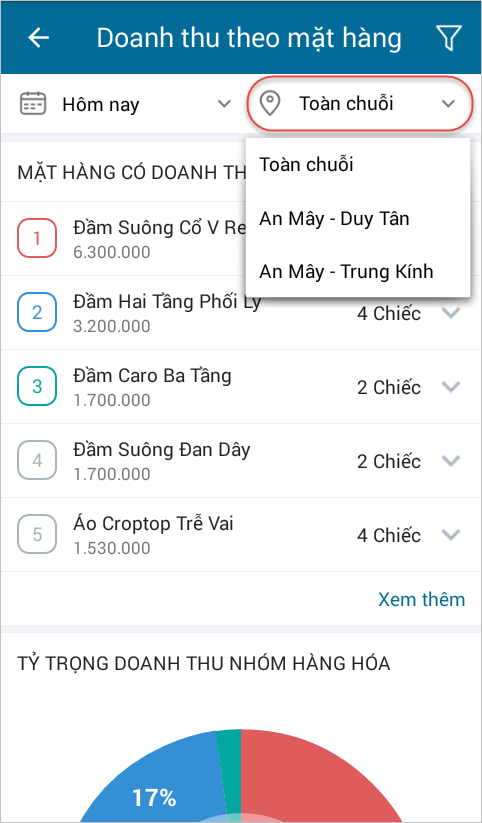 - Trường hợp cửa hàng hoạt động theo mô hình dạng chuỗi, nhấn Toàn chuỗi để xem doanh thu theo mặt hàng của toàn chuỗi hoặc các riêng từng cửa hàng trong chuỗi.