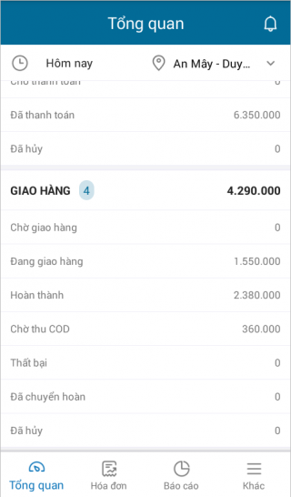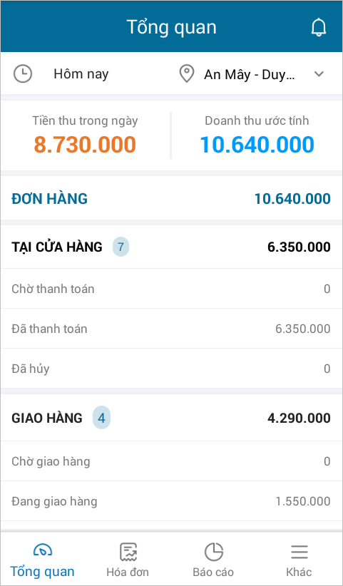 Để xem tình hình hoạt động kinh doanh trong ngày của cửa hàng, thực hiện như sau: