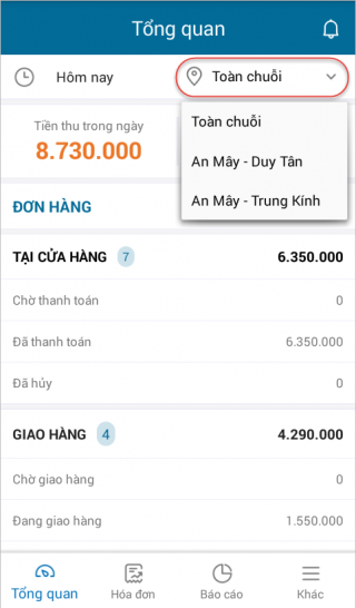 - Trường hợp cửa hàng hoạt động theo mô hình dạng chuỗi, nhấn Toàn chuỗi để xem Tình hình hoạt động trong ngày của toàn chuỗi hoặc các riêng từng cửa hàng trong chuỗi.