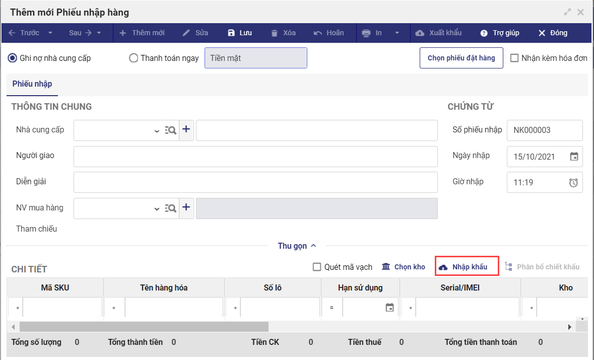 - Trên màn hình Thêm mới Phiếu nhập hàng, nhấn Nhập khẩu.