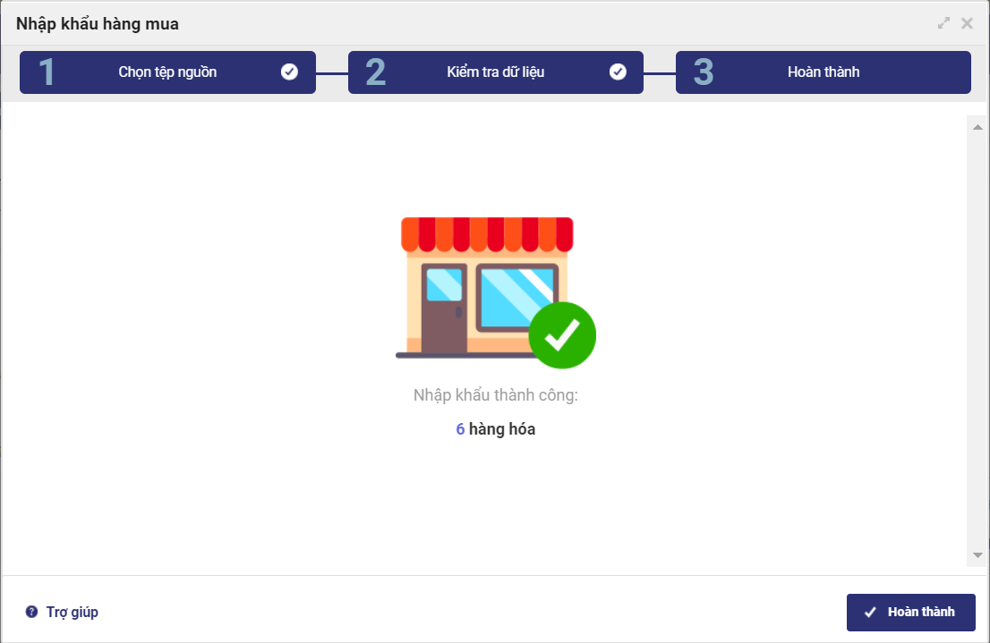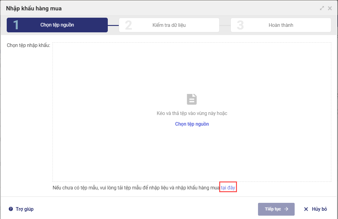 - Tại màn hình Nhập khẩu hàng mua, nhấn Chọn tệp nguồn để tải lên file excel đã thiết lập.
