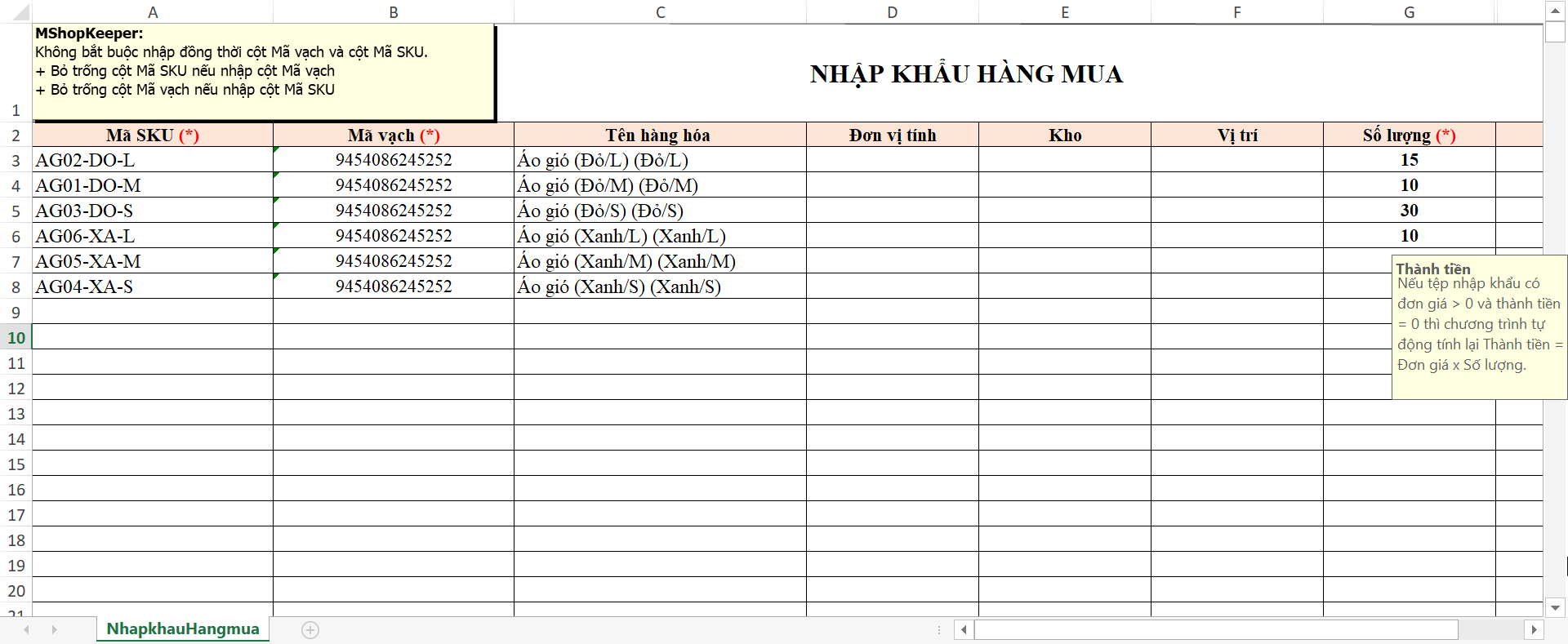 - Khai báo hoặc sao chép thông tin hàng hóa mới nhập vào file excel.