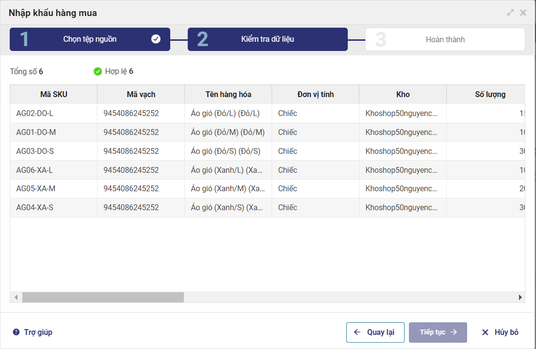 Lưu ý: Phần mềm chỉ cho phép nhập khẩu những hàng hóa đã có trong danh mục. Với những hang hóa chưa có sẵn, cần thực hiện khai báo trên phần mềm. (Xem hướng dẫn khai báo hàng hóa tại đây)