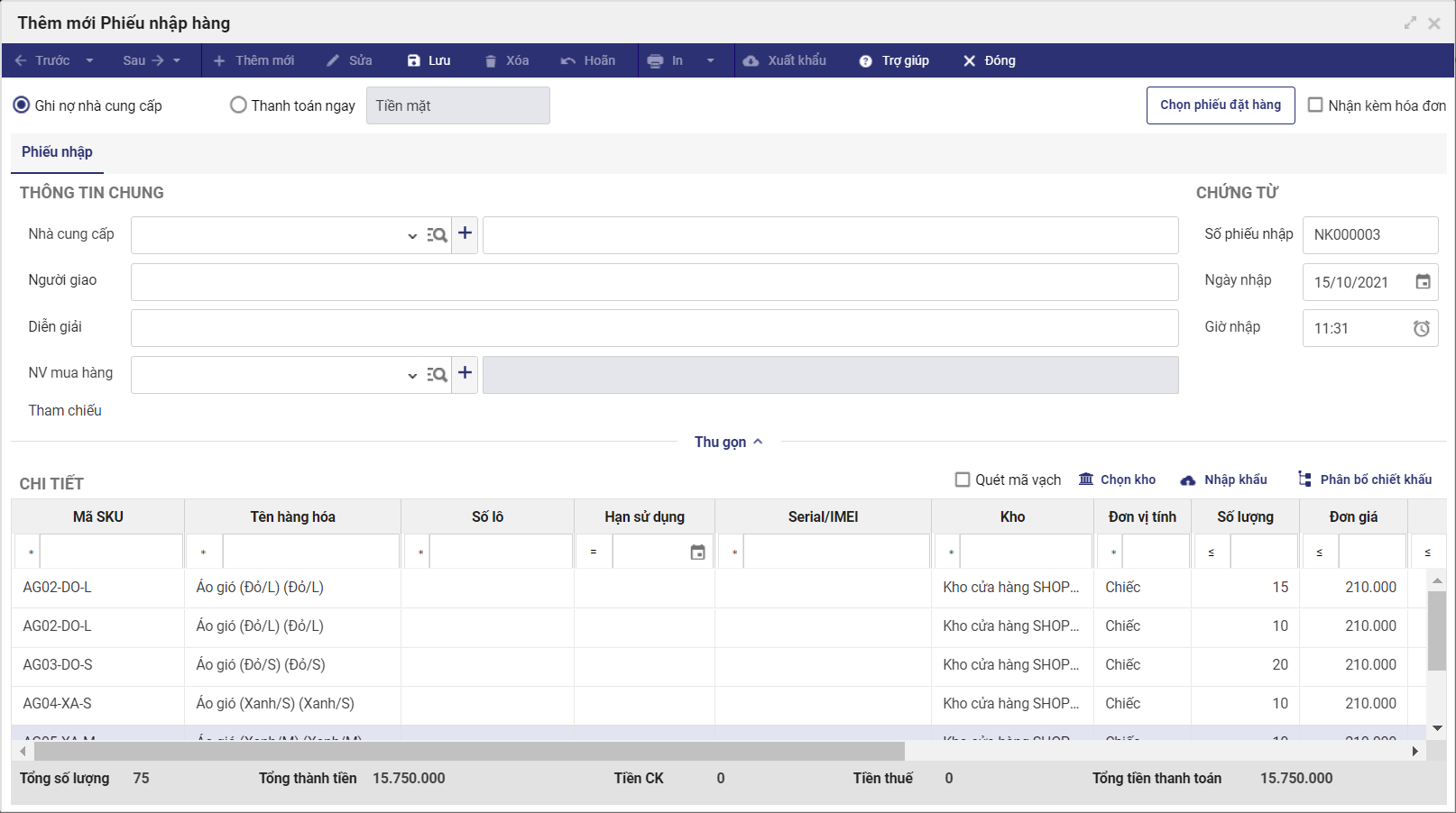 - Hàng hóa nhập khẩu đã được thêm trên phiếu nhập.
