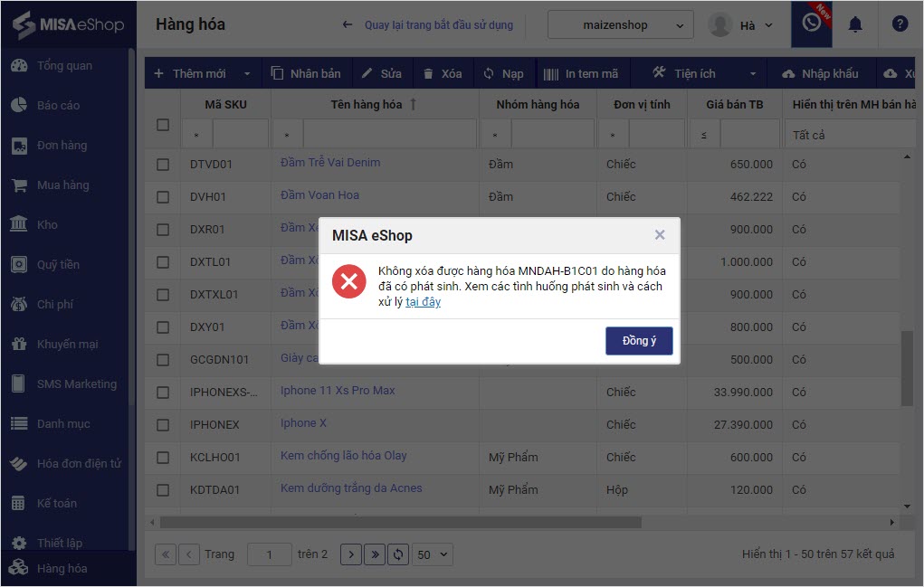 Lưu ý: Trường hợp hàng hóa đã xuất kho bán hàng thì không thể xóa được hàng hóa.
