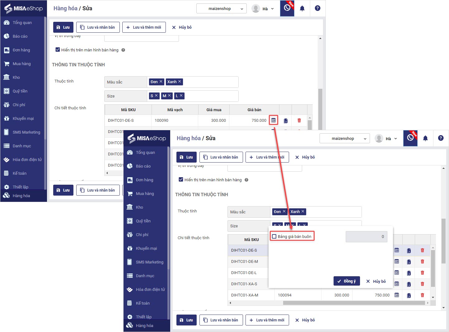 • Cửa hàng vào combo hàng hóa, xóa thành phần hàng hóa
