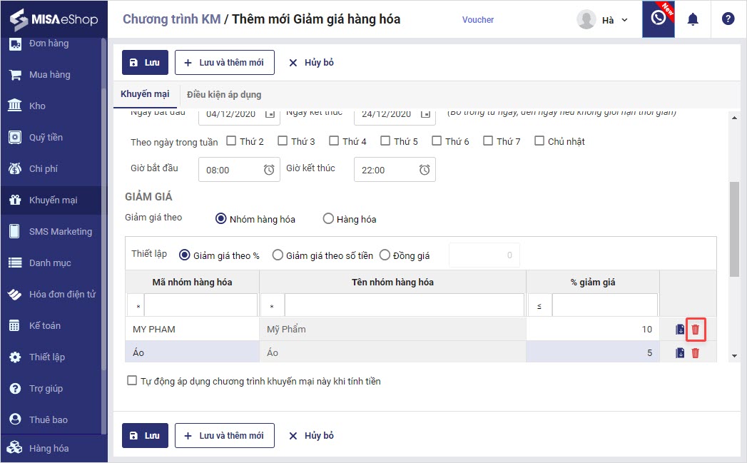 Ví dụ: Xóa hàng hóa trong khuyến mại giám giá hàng hóa như hình dưới: